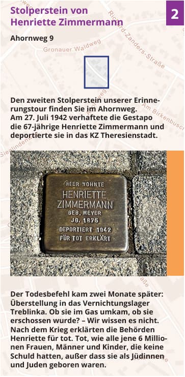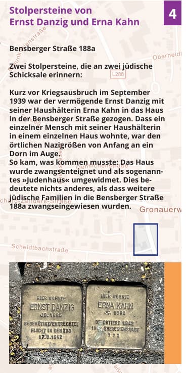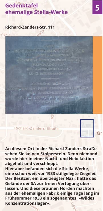 Der ca. 3,6 km lan­ge Rundweg mit 5 Stationen führt zu Stolpersteinen und einer Gedenktafel am Standort der ehe­ma­li­gen Stella-Werken.